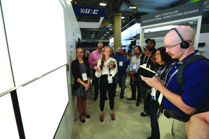 Lutron’s elegant Alisse wall control panels greeted us at our first stop on the tour. These luxurious, customizable controls are hand-crafted with an innovative technical approach and sleek architectural design. Lutron’s compatibility with Ketra lighting made for a great demonstration of how important natural dimming is to human-centric lighting, and Palladiom wire-free shading options performed smoothly with whisper-quiet operation.