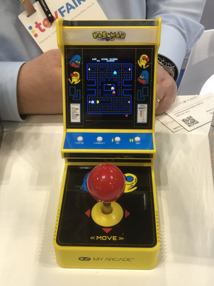 At the My Arcade/Dream Gear booth, Moris Mirzadeh displayed the portable retro PAC-MAN Joystick Player, a handheld take on the classic arcade favorite. The officially licensed device features a high-resolution 3.5″ full color vertical screen, intuitive joystick controls, adjustable brightness, a 3.5 mm headphone jack, and saves high scores. Powered by 4 AA batteries or USB-C, it offers on-the-go nostalgia with built-in sound and modern convenience.