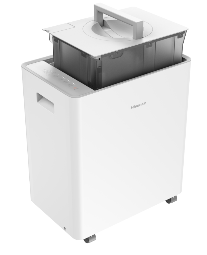 Addressing one of the most persistent pain points in home comfort, Hisense introduces the world’s first dehumidifier with a top-lift water collection system featuring a 18-pint (10-liter) top-mounted water cartridge that eliminates the need for bending, lifting, and prevents spills. A patented internal pump moves water upward into the removable top container, delivering 38% more capacity than traditional models while dramatically improving accessibility.