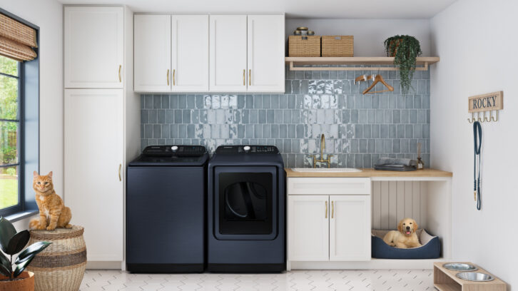 Samsung is also introducing its first laundry products specifically designed for pet owners. The Smart Top Load Washer with Pet Care Solution has an innovative wash cycle that creates dynamic water currents to loosen dirt and rinse hair through specially designed dual pet hair filters, trapping hair inside. The filters can easily be removed and cleaned, similar to cleaning laundry lint filters. For heavily soiled items, you can skip the laundry room sink and just scrub and pretreat items with the washer’s built-in Active WaterJet faucet. Save yourself time and effort and wash more pet beds and blankets in a single load, thanks to the Extra-Large 5.4 cu. ft. capacity drum.