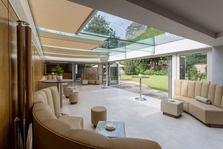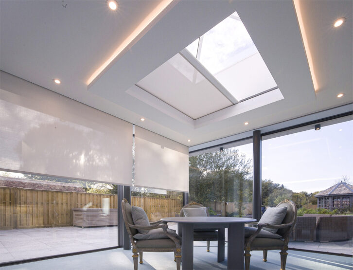 The Tess 140 can be installed at any angle thanks to a single-barrel tensioning mechanism that keeps the fabric panel under constant tension. The Tess 140’s clean-cut style and nearly invisible wire guides blend seamlessly into the glazing surround for a nearly invisible solution for skylights, atria, and other openings up to 157 inches wide (depending on fabric).