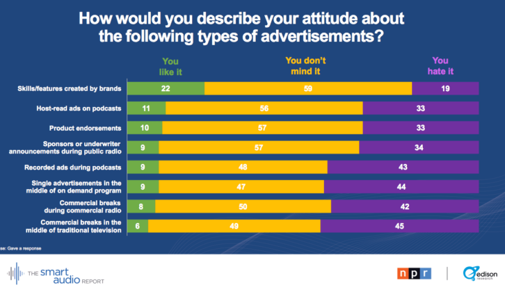 The “Smart Audio Report” also explored attitudes toward different types of advertising. The most popular type appears to be the skills or features created by brands; 22 percent said they like them, and 59 percent said they don’t mind them. TV commercials appear to be the most hated — 45 percent said they don’t like them and only 6 percent like them.