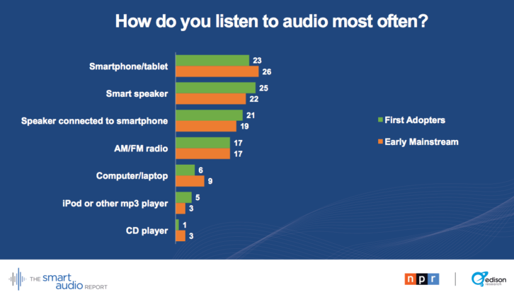 The report queried respondents about listening habits, and 25 percent of First Adopters said that smart speakers were the primary device they use to listen, compared to 17 percent who favor AM/FM radio and 23 percent who use either their smartphone or tablet most often. Among Early Mainstreamers, the most popular option is actually the smartphone/tablet at 26 percent, followed by smart speakers at 22 percent, and AM/FM radio at 17 percent.