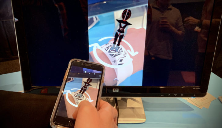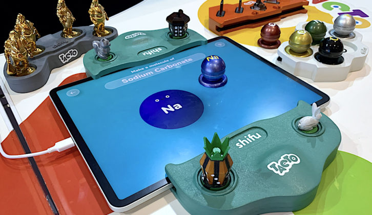 Rather than having to buy a separate display to play AR board games, this planned mixed-reality platform employs a consumer’s existing tablet suspended between two trays filled with physical game figurines or pieces. The Shifu Tacto app will initially include four games, growing to 10 by the end of the year, including classics such as chess and Snakes & Ladders as well as original activities, such as the chemistry learning game pictured. Action is accomplished via touch combined with moving or placing the game pieces on the appropriate spot on the tablet surface.