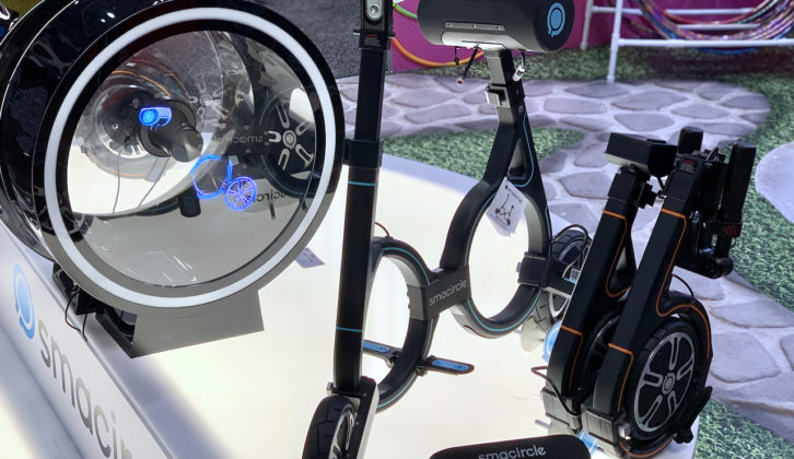 An e-bike can only be ridden so far – but what happens when you reach your destination or you run out of juice? Smacircle answers that question with this S1 foldable carbon fiber e-bike that weighs 22 pounds that fits in a backpack – your own, or, later this year, into a specially designed backpack ($99.99) or wheeled trolley bag ($199.99). Unfolded, the S1 will speed along at 12-14 MPH for an hour – around 15 miles total. It’ll carry a rider weighing up to around 240 pounds and its battery, located in the seat, requires 3.5 hours to recharge. There are three vertically-mounted LED headlights in front and a rear red brake LED.