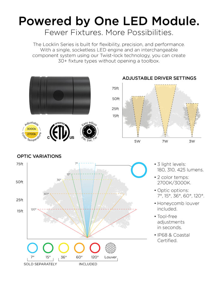 At the heart of the system is the versatile Locklin LED module. This innovative light engine boasts built-in controls to fine-tune brightness (3W, 5W, 7W delivering 175, 300, 425 lumens), switch color temperatures (2700K or 3000K), and easily swap optics for 5 different beam spreads (7°, 15°, 36°, 60°, 120°). The module delivers high-fidelity light (CRI 93.4+, IES TM-30 Rf 94, Rg 99) for accurate natural rendering of foliage and architecture. Each fixture includes a honeycomb louver for glare control. (CRI = Color Rendering Index)