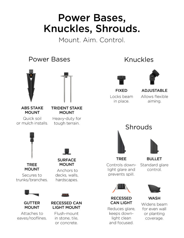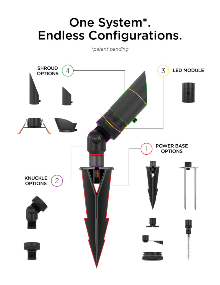 The foundation of the Nightscaping launch is the Locklin Series. Designed for lighting designers, integrators, and installation teams alike, Locklin is a logical, repeatable outdoor lighting system that removes guesswork from specification, installation, and long-term service. Built from four intuitive elements — application-based power bases, precision aiming knuckles, a single adjustable LED light module with interchangeable optics and glare-control modifiers — the Series enable hundreds of custom lighting configurations from a streamlined, modular platform. The result is faster installs, simplified inventory, and a smarter, more efficient approach to professional landscape lighting for custom integrators.